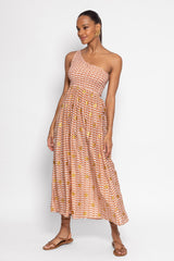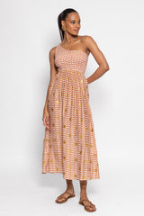 Made in brown and white spirals print adorned by gold sun glitter, Joema has an asymmetric top entirely made in smock. Sublime by gathers, the flared bottom brings lightness to movements.