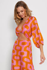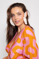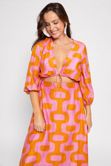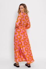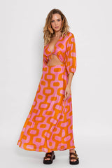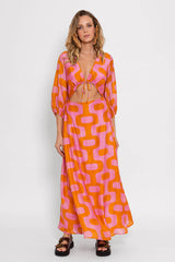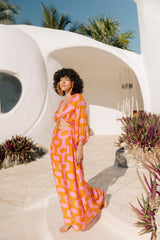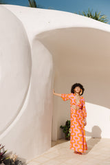 Made in an exclusive Sundress print which was imaged and developed by our designer, Kim is a long and light dress made up with a top which needs to be closed thanks to a drawstring link that creates a plunging V neckline and reveals a part of your belly. Long and flared sleeves are tightened at the cuffs for more volume.