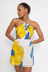 Sublime by shiny threads, the flowery print was imagined and developed by our designer. Naya is a sleeveless dress with an open back. This short dress has spaghetti links and cut outs on the sides which reveal your waist.
