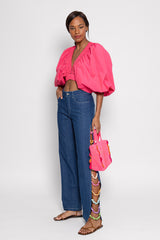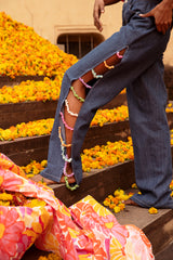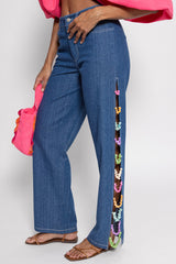 Paul is a denim pant with indented slit entirely adorned by colorful shells which brings feminity and originality to your look. The white topstitches highlight pant details. Opt for a total look with Alicia top.