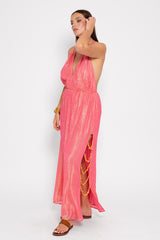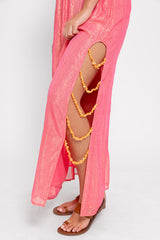 Entirely adorned by shiny yarns, Naty has a plunging V neckline and an open back. This colorful sleeveless dress has drawstring links on each side that can be tied behind the head and creates gathers on the front. An elastic allows to adjust the dress at your waist. Slit on the side, series of orange shells bring a fancy touch. This dress is a perfect dress as a bridesmaid dress, cocktail dress, evening dress or wedding guest dress.
