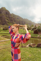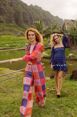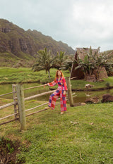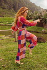 Inspired by a bandana print, the fabric was imagined and developed by our designer. Aline is a colorful jumpsuit with flared sleeves tightened at the cuffs thanks to an elastic for more volume. Its V neckline has an elastic embellished by little gathers. An elastic allows to adjust the jumpsuit at the waist and create a flared bottom.