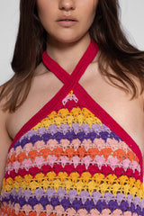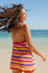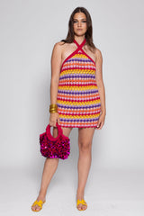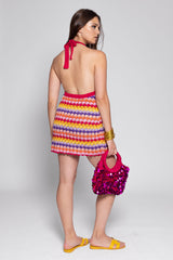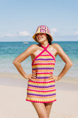 Made in a colorful crochet handmade by our artisans, Amari is the short dress to have in your ward robe this summer. The halter neck tie closure is adorned by a crochet yoke crossed on the front and tied behind the head offering a rounded open back. Mafalda hat made in crochet will perfectly complete your look. This dress is the perfect summer dress.