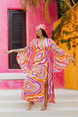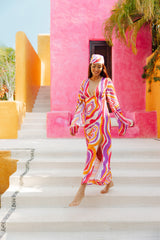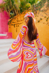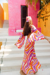 Adorned by an exclusive Sundress print made up of colorful stripes, Arsen has a plunging square neckline and a deep open back. Slit and flared sleeves bring lightness to movements. Slit on the side, this long colorful dress is synonym of feminity. It has an invisible zip fastener on the side.