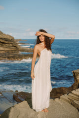 Embroidered by shiny yarns that catch the sun, Bea is a light dress with a fancy neckline adorned by a wooden ring and a link that needs to be tied behind the head. A buttonhole runs along the piece and reveals a slit which prettily discloses your legs and brings lightness to movements. This long dress has a rounded open back and very indented armholes.