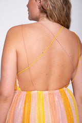 Entirely highlighted by colorful stripes and shiny yarns, Cali is a long dress with an original open back. The top is adorned by a slit that brings lightness and feminity. Slit on the side, the bottom is tightened at the waist thanks to an elastic. Cali is the perfect evening dress.