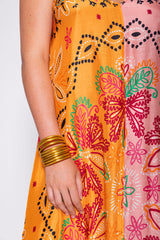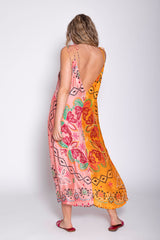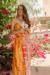 Inspired by a bandana print, the fabric was imagined and developed by our designer. Cary is a flared bicolor dress defined by a V neckline and a deep open back that can be adjusted on the shoulders thanks to spaghetti links. A separate belt can be tied at the waist according to your mood.
