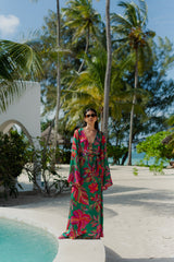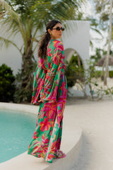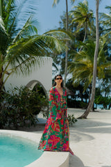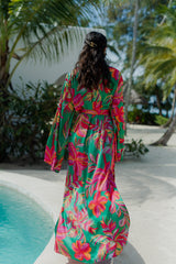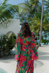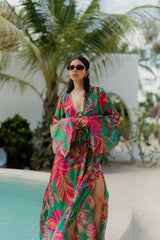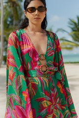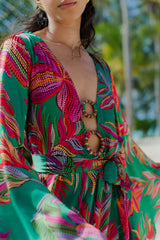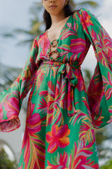 Made in an exclusive and best-seller print inspiring by the spring vibrance, Esmee dress has a plunging V neckline adorned by pearled rings which bring delicate and feminine touch. Long and flared sleeves and slit on each side give lightness to movements. The separate belt allows you to highlight the waist according to your mood.