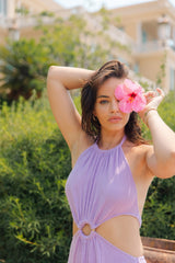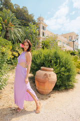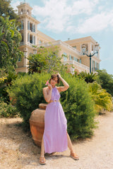 Filiza dress is made up of cut out embellished by a ring which creates little gathers. The top has a halter neck with tie closure and a backless. Slit on each side, the bottom prettily discloses your legs and brings lightness to movements.