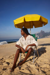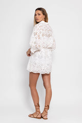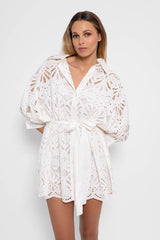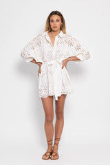 Made in eyelet, Florine is a shirtdress with flared sleeves prettily tightened thanks to shirt cuffs. A underslip and a separate belt complete this piece.