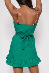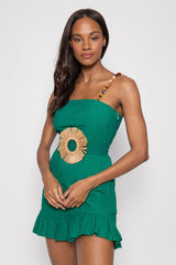 Francine is a short dress prettily adorned by stones straps. This bustier dress has a gathered flounce that runs along the bottom. It as an invisible slide fastener on a side. A separate belt adorned by a raffia ring can be tied at the waist according to your mood.