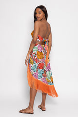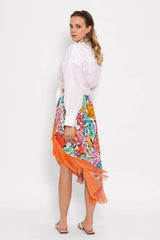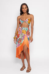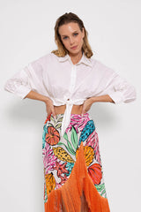 Inspired by Tahitian vibes, this colorful fabric was imagined and developed by our designer. Grenade is a tulip skirt entirely adorned by orange fringes which offer lightness to movements. Opt for a total look with the Grenade top.