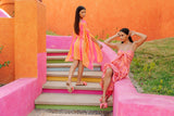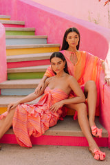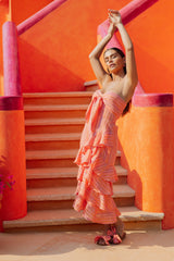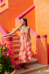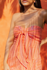 Prettily adorned by shiny multicolor yarns, this adjusted dress is adorned by gathered flounces that run along the bottom and bring an original and feminine touch. Slightly sweat-heart, this bustier dress is embellished by a tie on the front and smocked on the back. This must be a perfect cocktail dress for this summer.
