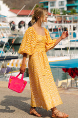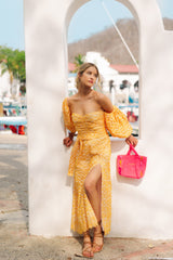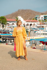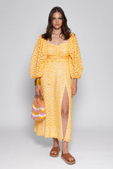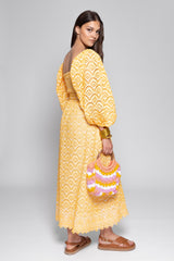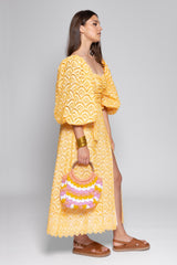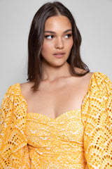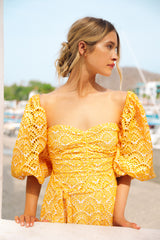 Made in eyelet sublime by a yellow topstitching, Lia is a bustier dress with baby-doll sleeves which can be worn on or under the shoulders. Slightly sweat-heart, the bustier has a smocked back and little gathers on the front. Slit on the side, the flared bottom of the dress prettily discloses your legs. A separate belt can be tied at the waist according to your mood. This dress is synonym of feminity.