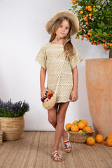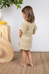 Made in crochet, Mafalda is a shift dress with a square neckline. Golden threads run along the piece and highlight crochet details. Fabric was realized by our artisans.