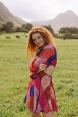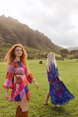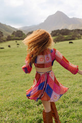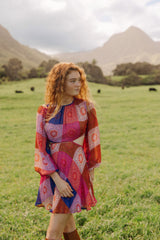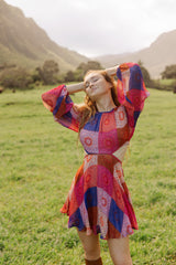 Inspired by a bandana print, the fabric was imagined and developed by our designer. Neia is a colorful dress made up of cut out embellished by links. The long and flared sleeves are tightened at the cuff and the tie closure neckline is adorned by little gathers. Very flared, the bottom brings lighthness to movements.